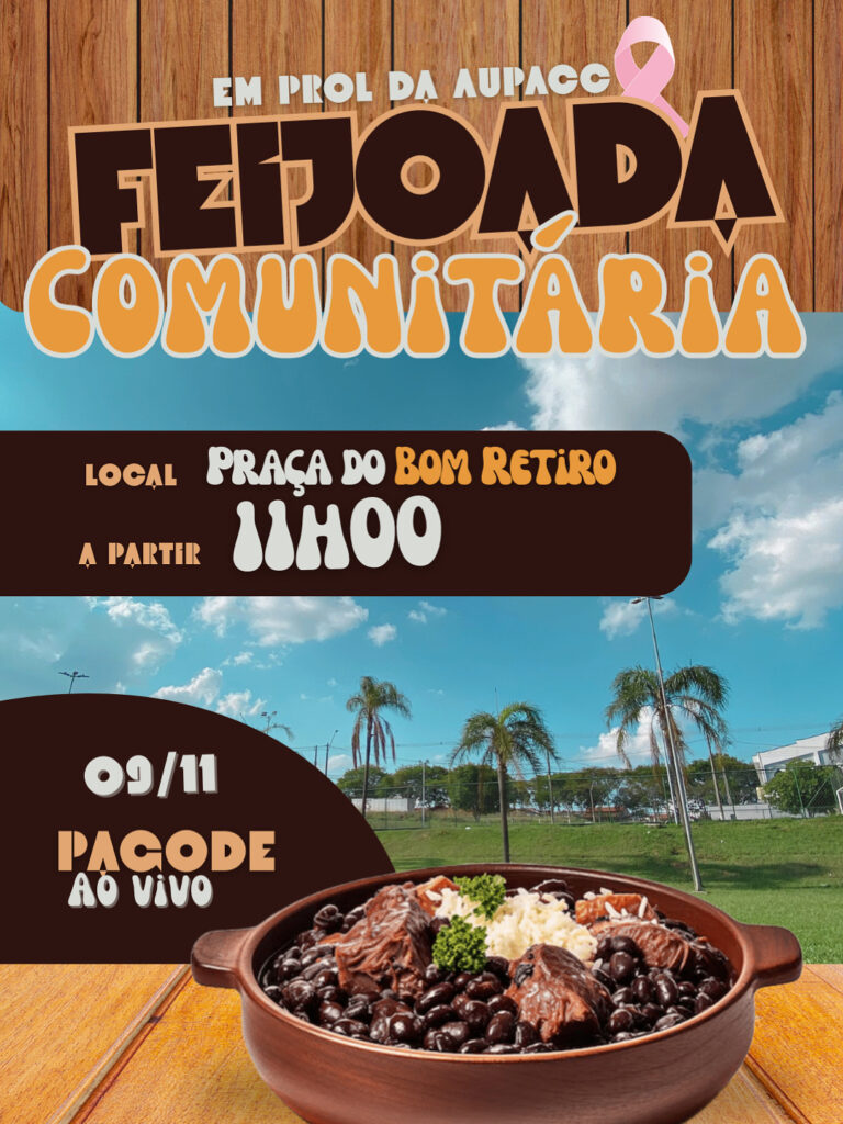 A Feijoada Comunitária: Pagode na Praça de Paulínia é uma ação social que une gastronomia, cultura e solidariedade em prol de uma causa nobre. Realizada em parceria com a AUPACC (Associação Amigos Unidos Contra o Câncer de Paulínia), a iniciativa tem como objetivo arrecadar fundos para apoiar o trabalho da instituição, que oferece assistência a pacientes em tratamento oncológico e suas famílias.