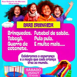 Torneio de futebol, com brinquedos, distribuição de caçhorro-quente para as crianças e muita diversão.